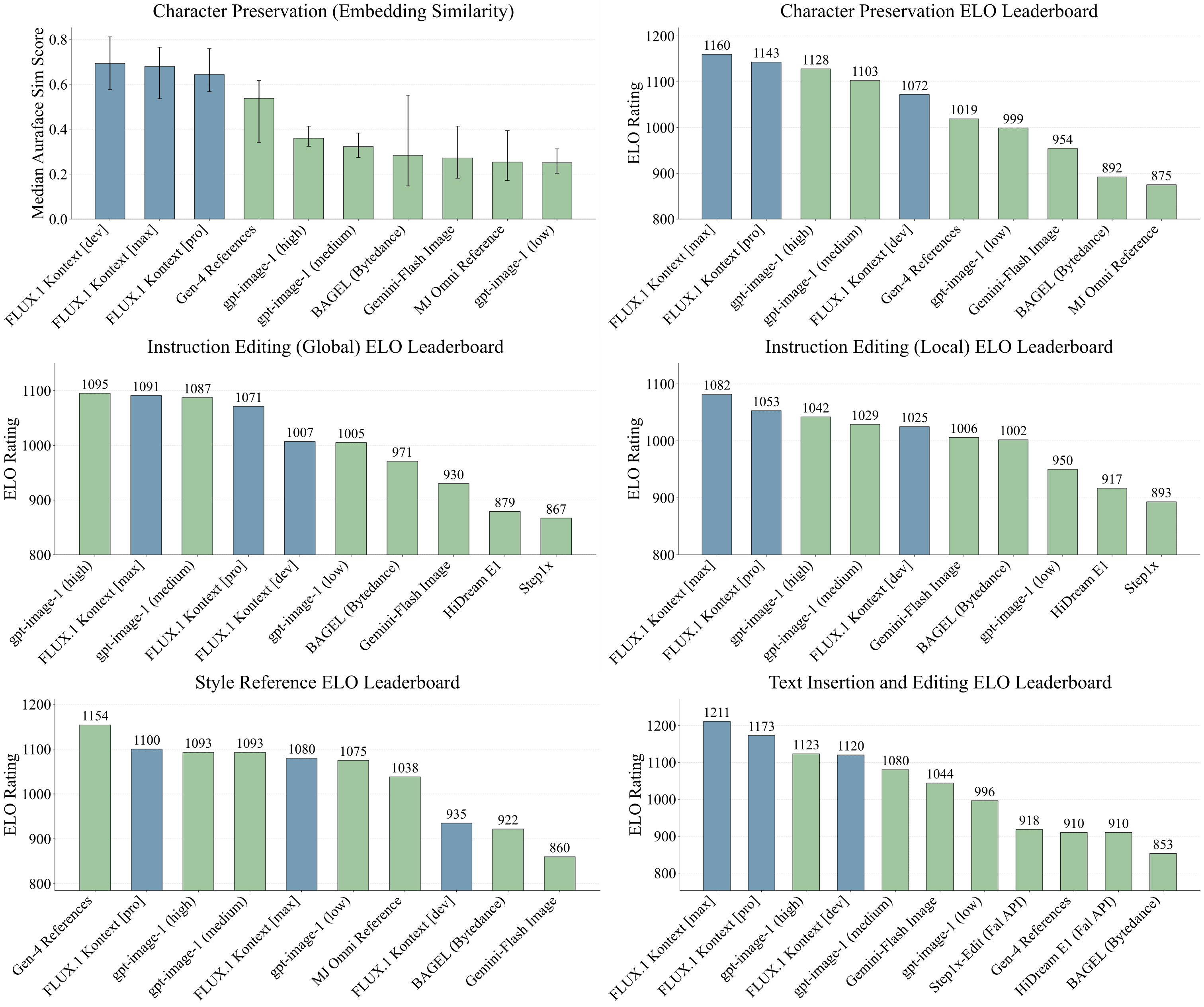 We show evaluation results across six in-context image generation tasks. FLUX.1 Kontext [pro] consistently ranks among the top performers across all tasks, achieving the highest scores in Text Editing and Character Preservation